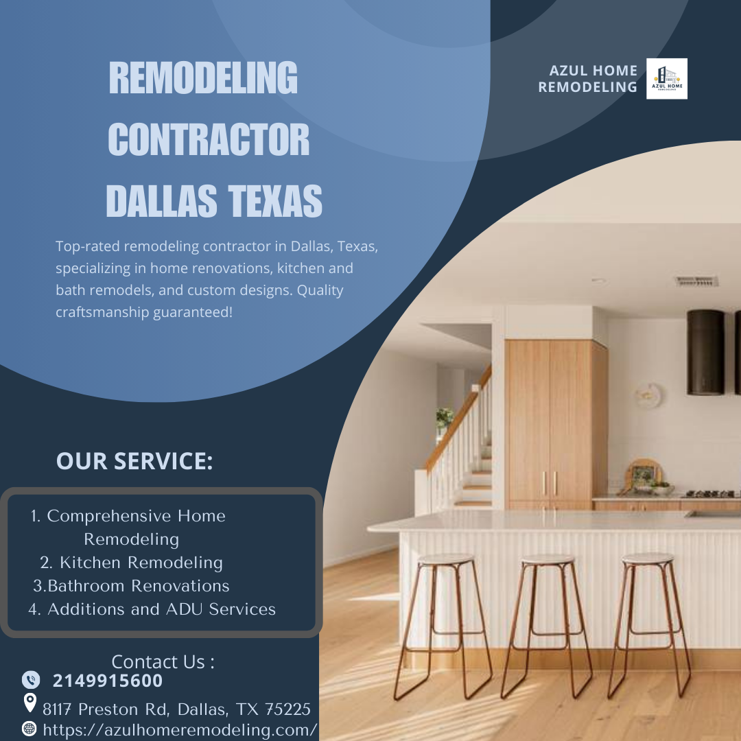 Azul Home Remodeling, located at 8117 Preston Rd, Dallas, TX 75225, offers comprehensive interior and exterior remodeling services, including kitchen and bathroom renovations, ADU/additions, landscaping, and new construction. Our team is dedicated to transforming your home to reflect your unique style and needs. We operate from Monday to Sunday, 24 hours.